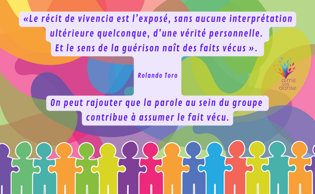 C’est ainsi que nous parlons de « récit de vivencia ». Et lorsque le groupe existe de fait en tant que tel, le partage vivenciel de chacun de ses membres est perçu et vécu par tous comme une danse totale. C’est ce qui fait entrer les personnes dans ce que nous appelons « la parole émue ». Elle est émotion pour qui l’offre et pour qui la reçoit.